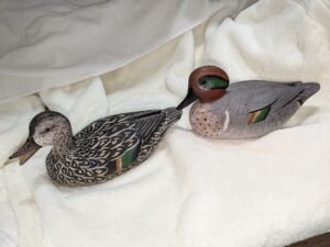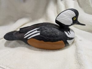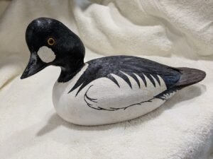 Gerald Kidder’s decoys were working decoys, intended for hunting waterfowl. He never entered any carving contests or sold any of his decoys. He did, however, gift his decoys for fundraising events, particularly to those Organizations supporting new carvers. Many were gifted also to friends and family. It is estimated that he carved nearly 1000 decoys and other wood carvings in his lifetime. According to his daughter, he was a meticulous carver, paying attention to detail and the essence of each species he carved.