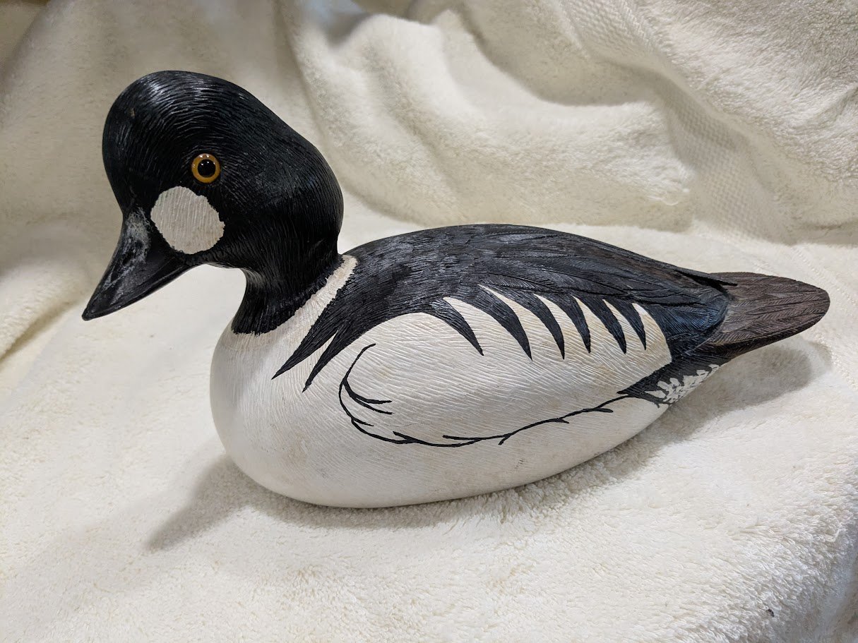 Buster began carving decoys early in life out of a need to attract waterfowl to harvest for food on their table and to satisfy the many East Coast “Sports” who wanted better duck shooting. He began carving in earnest in the early 1950s. Buster married several times over his lifetime and is survived by one daughter, Ruth Alfaro, now residing in Madison, WI. According to his daughter, his nickname came from the day he was born. His mother was a petite lady, and Buster was born over 10 pounds, a huge “Buster” as he was called!