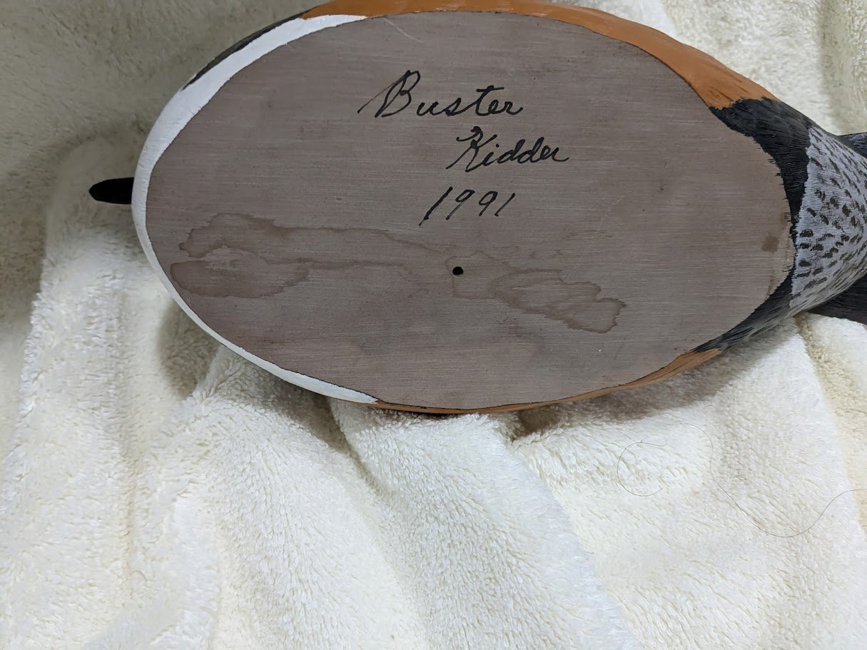 We know he carved canvasbacks, pintails, teal, mergansers, goldeneyes, coots, and wood ducks. We expect he carved most species of ducks, shorebirds, and songbirds, but there is no knowledge of him carving mallards. He carved his bodies from cedar, balsa, and tupelo while in Louisiana. Buster used pine for many of his heads. All of his decoys had glass eyes, and most were painted in oil paint. He began carving with hand tools and later used rotary carving methods. His decoys were painted with minimal blending and were very detailed and accurate to the species he carved. Buster was a student of decoy carving, consulting numerous peers and searching out the best books on carving and painting. He did draw some of his own patterns, but used a myriad of other carving patterns from his peers with different attitudes. He continually challenged himself in his carving methods. All of the decoys I have seen have his name and date on the bottom. Sometimes signed “Buster Kidder”, “BK” or “Handcrafted by Gerald Kidder”.