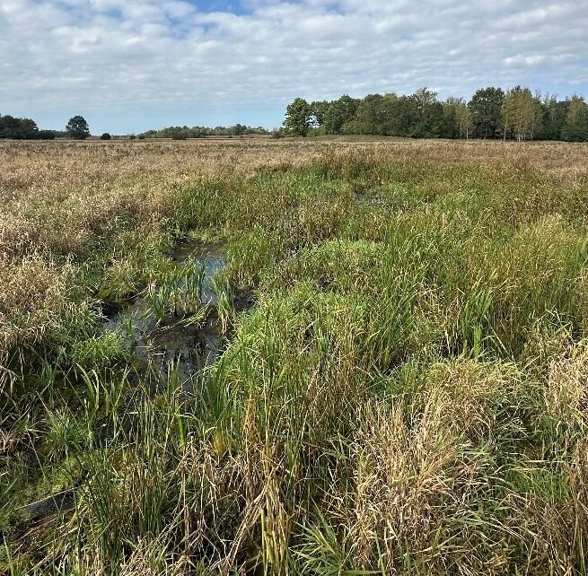 The wetlands are responding well to the work so far, but with limited precipitation in the second half of this year, we have yet to see the full effects. The scrapes are holding some water, and although the eyebrow berms are currently dry, the noticeable improvement in vegetation surrounding them indicates that soil hydrology is changing. With more rainfall, these low berms will capture surface flow and create small pockets of water. The ditch plugs and water control structure have spread water laterally across the restoration area, and we’re seeing more open-water habitat and a healthier plant community. For duck hunters, this restoration provides essential nesting and brood rearing habitat to increase local bird numbers, as well as creating some open water habitat to hunt over.