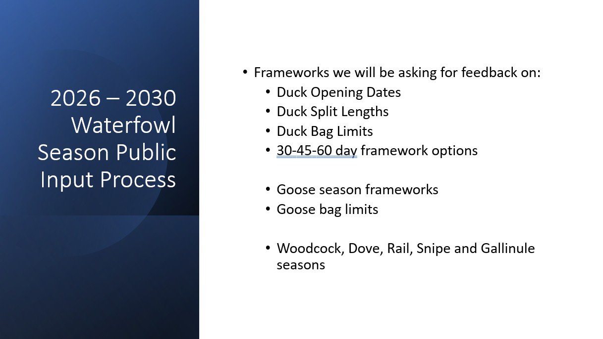 Review the 2025 waterfowl season and plan for 2026–2030 regulations.