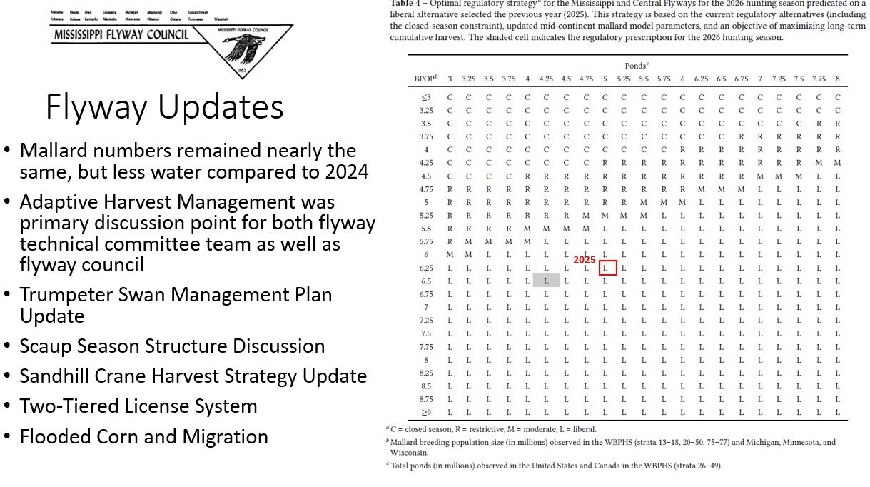 - Scaup Harvest Strategy: The Mississippi Flyway is hiring a research scientist to develop a new strategy, replacing the complex 1-bird/15-day, 2-bird/45-day system that lacks biological justification.