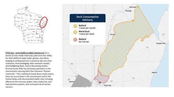 - PFAS Contamination: A “do not eat” advisory was issued for mallards from the southern Green Bay Area of Concern (AOC) due to high PFAS levels, especially in juveniles. The DNR is expanding testing statewide.